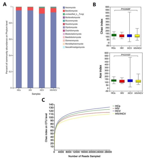 Taxonomy and alpha diversity of the four groups. (A)The community histograms at phylum level. (B) Chao and ACE diversity index of the four groups. (C) Rarefaction curves of Chao index at out level. Clustering was performed by Uparse 7.0.1090. Each curve represents the average of all repeats (±standard deviation) for each group of samples (HCs, HIV, HCV, and HIV/HCV). * p < 0.05, determined by unpaired Student’s t-test.