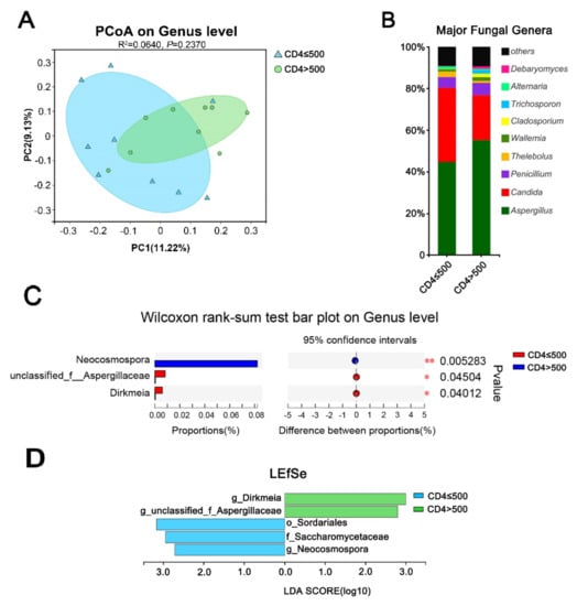 Furthermore, to investigate the effect of immune status on the intestinal fungal profile in HIV mono-infected patients, we studied the relationship between CD4 + T-cell counts and the gut mycobiome in the HIV mono-infected participants. As shown in Figure 3, patients with low CD4 + T-cell counts and patients with high CD4 + T-cell counts were found to have different fungal community characteristics. However, the PCoA analysis showed that the distribution of the samples from the HIV and HC groups was slightly different (Figure 3A). Similar to the results obtained when the HIV group was compared to the HC group, a community of bar plot analyses conducted at the class level (Figure S2) showed that histogram differences were mainly observed in the proportion of Eurotiomycetes, which was significantly decreased in the low-CD4 + T-cell group compared to in the high-CD4 + T-cell group, and in the levels of Saccharomycetes, which were significantly increased in the low-CD4 + T-cell group. Looking into the histogram composition at the genus level in depth, what is worth noticing is a sharp increase in Candida in the low-CD4 + T-cell group, indicating a high risk of opportunistic infection. Through further analysis, there were several genera worth noting (Figure 3C,D). More specifically, patients in the high-CD4 + T-cell group contained more g__ unclassified_f__Aspergillaceae and Dirkmeia, while Sordariales, Saccharomycetaceae, and Neocosmospora were mainly enriched in the low-CD4 + T-cell group, that is to say, the immunocompromised HIV patients.