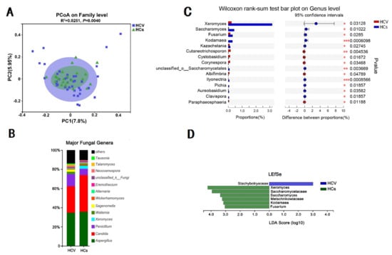 PCoA analysis showed that compared to the HIV mono-infection and HC group (Figure 2A), there were more similarities but fewer differences between the HCV mono-infection and HC group (Figure 4A). However, detailed histogram analysis at the genus level revealed a sharp decrease in Penicillium along with an elevated level of Candida in the HCV mono-infected group compared to in the healthy group (Figure 4B). Apart from these two genera, Wilcox analysis also illustrated that the HCV group had a decreased abundance of the genera Xeromyces and Saccharromyces (Figure 4C). LEfSe analysis revealed that a specific family, Stachybotryaceae, which was not previously found in humans, was significantly enriched in the HCV mono-infected group (Figure 4D).