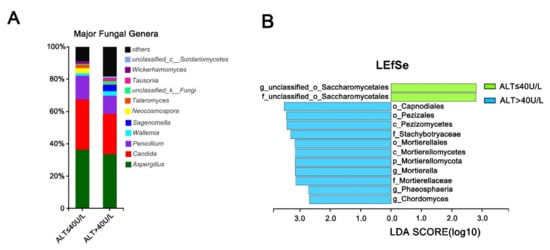 Effect of ALT level on the intestinal fungal profile of HCV mono-infected patients. (A) The community histograms of intestinal fungal genus levels between the ALT normal group (ALT ≤ 40 U/L) and the high-ALT-level group (ALT > 40 U/L) within the HCV mono-infected group; (B) LEfSe discriminant histograms between the two groups (LDA = 2.5).