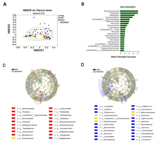 The random forest model also revealed the most predictive fungal genera that differed between the HIV group and the HIV/HCV co-infection group (Figure 6B), and the top two genera both belonged to the class Leotiomycetes mentioned above.