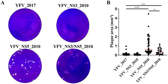 The first phenotypic feature we established was the plaque size formed by each YF clone-derived virus in Vero cells (Figure 1). YFV_2017 displayed a tiny plaque phenotype in Vero cells, similar to those detected with YFV_NS3_2010 (p = 0.144). YFV_NS5_2010 showed a larger and more heterogeneous plaque morphology in comparison with YFV_2017 (p < 0.0001), while YFV_NS3/NS5_2010, displayed an intermediate plaque size (p = 0.0004).