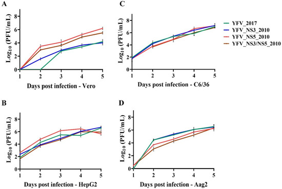 Vero cells were cultivated in Earle’s 199 medium supplemented with 5% FBS, 0.25% sodium bicarbonate, and 40 mg/mL gentamicin at a density of 40,000 cells/cm² in T-25 cell culture flasks. HepG2 were cultivated in DMEM medium (Gibco, Waltham, MA, USA) supplemented with 10% FBS, 1% (MEM) non-essential amino acids (NEAA; Gibco, Waltham, MA, USA), 1 mM sodium pyruvate (Gibco, Waltham, MA, USA), and 100 U/mL penicillin-streptomycin (Gibco, Waltham, MA, USA), also in T-25 culture flasks. These two cell lines were maintained in an incubator at 37 °C with a wet atmosphere and 5% CO2. C6/36 cells were grown in Leibovitz’s L-15 medium supplemented with 5% FBS, 10% tryptose broth (Gibco, Waltham, MA, USA), and 40 mg/mL gentamicin. Aag2 cells were cultivated in Schneider’s Insect medium (Gibco, USA), supplemented with 10% FBS and 100 U/mL penicillin–streptomycin. Both cells were seeded at a density of 80,000 cells/cm² in T-25 flasks, and were maintained in an incubator at 28 °C. All cells were seeded approximately 24 h before infection with YFV_2017, YFV_NS3_2010, YFV_NS5_2010, and YFV_NS3/NS5_2010 at MOI 0.02. The culture medium was discarded and the inocula were prepared in adequate medium with a final volume of 0.5 mL were added to the cell monolayers for viral adsorption. The cells were incubated in the appropriate conditions for 1 h with gentle agitation every 15 min. The viral suspensions were discarded, and 10 mL of cell medium were added to the culture flasks. For 5 days, the cell supernatants were collected daily for viral quantification via plaque assay. This experiment was performed in 3 to 4 replicates for better statistical validation. The viral titers were plotted using Prism version 8 (GraphPad Software, San Diego, CA, USA), and one way ANOVA was used to statistically analyze these data with Dunnett’s multiple comparisons test.