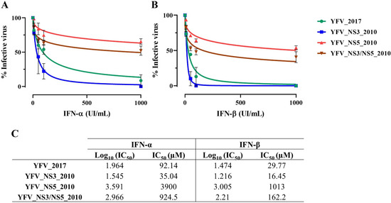 The viruses carrying the NS5 2010 variations, YFV_NS5_2010 and YFV_NS3/NS5_2010, displayed a lower sensitivity to both types of IFN-I. There is a tendency for YFV_NS5_2010 (IFN-α IC50 = 3900 µM; IFN-β IC50 = 1013 µM) to be more resistant to IFN-I than YFV_NS3/NS5_2010 (IFN-α IC50 = 924.5 µM; IFN-β IC50 = 162.2 µM), but the differences were not statistically significant. YFV_NS3_2010 showed the highest sensitivity to IFN-I (IFN-α IC50 = 35.0 µM; IFN-β IC50 = 16.5 µM), but this was not significantly different from YFV_2017 (IFN-α IC50 = 92.1 µM; IFN-β IC50 = 29.8 µM) (Figure 3 and Figure S2).