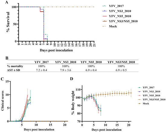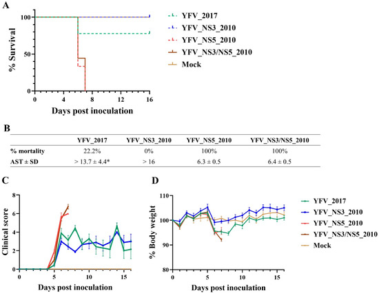 Infection in AG129 mice with yellow fever clone-derived viruses. (A) Kaplan–Meier survival curves of each virus. (B) Table summarizing the survival curves results (AST: Average Survival Time; SD: Standard Deviation). (C) Mean of clinical scores and (D) mean of percentage body weight presented by each group of infected mice. All analyses were performed in Prism, version 8(GraphPad Software, San Diego, California, USA. * p < 0.1.