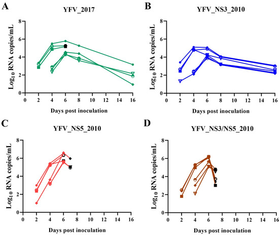 Viremia of infected AG129 over time, determined via qRT-PCR. The concentrations of RNA copies by mL of blood were transformed in log10 and plotted for each time point post-inoculation of animals infected with YFV_2017 (A), YFV_NS3_2010 (B), YFV_NS5_2010 (C), and YFV_NS3/NS5_2010 (D). The black symbols represent the mice that reached the humane endpoint and were euthanized before the sixteenth-day post-inoculation.
