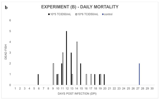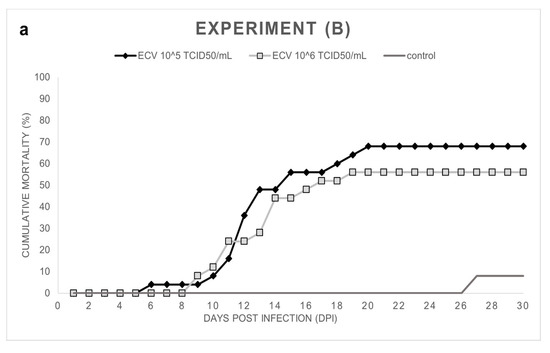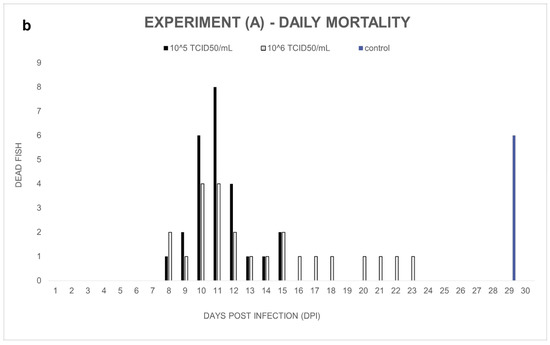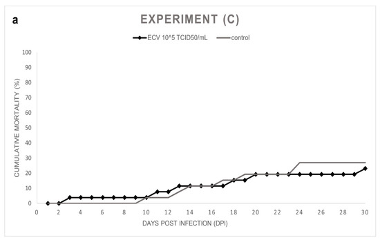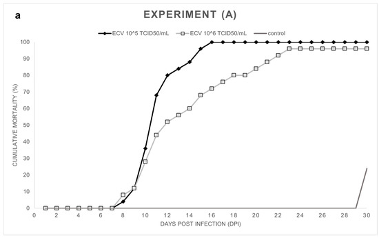 Experiment (A): Notable cumulative mortality was recorded in the groups infected by ECV: 100% in the group exposed to 105 TCID50/mL ECV, and 96% in the group exposed to 106 TCID50/mL virus (Figure 1a). The statistical analysis confirmed that there was no significant difference (p = 1.0000) between the level of mortality caused by the two virus concentrations. The decease started at 8 dpi and stopped at 23 dpi (Figure 1b). Necropsy was performed on every fish, and several macroscopic lesions, including anemia and whitish lesions, mainly in the liver, were detected. On the skin near the lower jaw or the gill, and in the fins of fish, diffuse subcutaneous hemorrhages could be detected. Anorexia was observed in all the virus-infected groups (Exp. A, B, and C). In the control group, cannibalism caused 24% mortality in the last two days of the experiment. Still, significant differences (p < 0.0001) were detected between the mortality rates of the control and the infected groups.