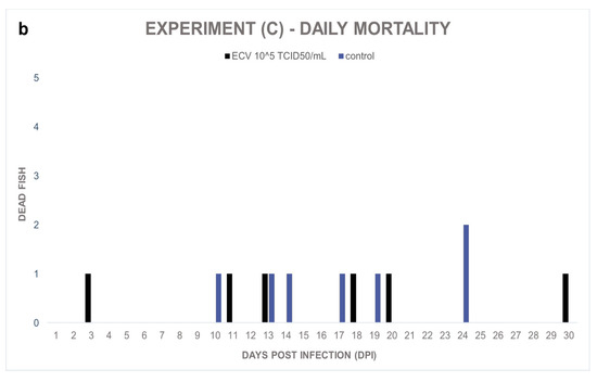 (a) Cumulative mortality in Exp. (C), wels catfish (Silurus glanis) of 4 months (n = 26/group) were infected by bath with ECV at 21 ± 0.5 °C for 1 h. Mortality was recorded from 0 to 30 dpi, including the control group. (b) Daily mortality in Exp. (C) shows the number of dead fish per day.