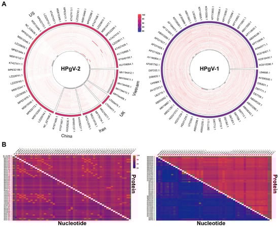 Nucleotide sequence diversity and pairwise alignment of HPgV-1 and HPgV-2 isolates with different countries of origin. (A) Whole-genome sequences of HPgV-2 and HPgV-2 from Vietnam, United Kingdom, Chinese and United States isolates were aligned with MAFFT multiple alignment and visualized with circles. The consensus sequence was generated with a 70% threshold. Mismatches are highlighted in red, and gaps are indicated in gray. The overall identities of each strain are indicated on a scale from 80% (blue) to 100% (red) in the peripheral ring. (B) Pairwise alignment of the nucleotide sequences and protein sequences of HPgV-1 (right panel) and HPgV-2 (left panel) strains. The heat map scale is from 85% (blue) to 100% (red).
