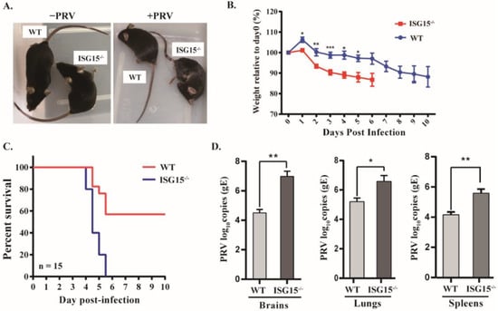 3.1. Mice Lacking ISG15 Are More Susceptible to PRV Infection