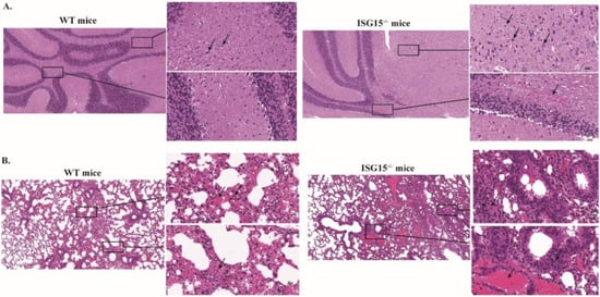 Histopathological examination of brains and lungs of infected ISG15-/- and WT mice. WT (n = 10) and ISG15-/- (n = 10) mice were intraperitoneally infected with PRV. At 4 dpi, the brains and lungs of infected mice were collected, sectioned and stained with hematoxylin-eosin. Magnified regions are indicated with rectangles in (A,B). Scale bar: 100 μm and 20 μm.