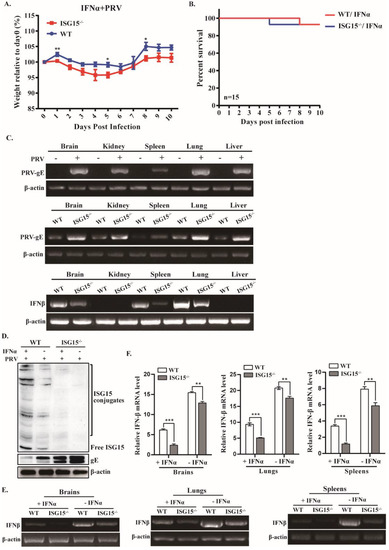 Type I IFN (IFN-α/β) signaling is critical for host restriction of viral infection [31]. To test whether ISG15 is involved in type I IFN-mediated antiviral innate immune response in vivo, we first compared the body weight between WT and ISG15-/- mice after infection with PRV with or without IFNα treatment. Starting on day 6, the infected mice pretreated with IFNα started to recover their body weight, albeit at a significantly lower rate compared to WT mice (Figure 3A). Moreover, ISG15-/- mice pretreated with IFNα exhibited a dramatically reduced mortality rate, with no significant difference compared with WT counterparts (Figure 3B). We also compared the body weight and survival rate between female and male mice, with no significant difference observed (data not shown).