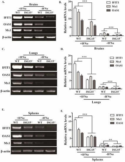 Several ISGs mRNA levels are downregulated in infected ISG15-/- mice. WT and ISG15-/- mice were intraperitoneally infected with PRV and pretreated or untreated with IFNα. At 4 dpi, the mRNA levels of IFIT1, OAS1 and Mx1 in brains (A), lungs (C) and spleens (E) of infected mice were examined by RT-PCR and RT-qPCR (B,D,F), respectively. ** p < 0.01; *** p < 0.001.