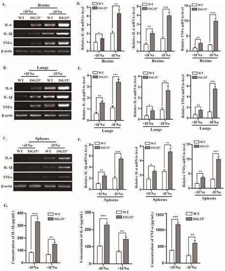 Cytokines are crucial in combating viral infection and are involved in the regulation of immune and inflammatory responses, including interleukin 1β (IL-1β), interleukin-6 (IL-6) and tumor necrosis factor alpha (TNF-α) [32]. The mRNA levels of IL-1β, IL-6 and TNF-α were markedly elevated in brains, lungs and spleens of infected ISG15-/- mice relative to WT mice (Figure 5A–E). After treatment with IFNα, the mRNA levels of these cytokines were significantly reduced, whereas their expression levels were still higher in ISG15-/- mice than WT mice (Figure 5A–E). Furthermore, the protein concentrations of IL-1β, IL-6 and TNF-α were measured using ELISA assay, and a similar tendency was observed in protein levels. As shown in Figure 5G, IL-1β, IL-6 and TNF-α protein levels were significantly higher in the serum of ISG15-/- mice than those in WT mice with or without IFNα treatment (Figure 5G). These data suggest that ISG15-/- mice displayed a more severe inflammatory response than WT mice, indicating that ISG15 deficiency leads to excessive production of inflammatory cytokines.
