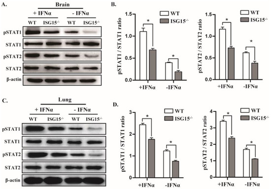 Because ISG15 deficiency impaired IFNβ expression in response to PRV infection, as shown in Figure 3, we speculated that ISG15 may affect IFNβ production by targeting phosphorylated STAT1 (pSTAT1) or/and STAT2 (pSTAT2). Therefore, we tested whether ISG15 deficiency affects the expression of pSTAT1 and pSTAT2 in tissues of infected mice by Western blot. We found that the expression of pSTAT1 and pSTAT2 was significantly reduced in brains of ISG15-/- mice in comparison with WT counterparts. Moreover, IFNα stimulation promoted the expression of pSTAT1 and pSTAT2 in the brains of infected mice (Figure 6A,B). Similar results were observed in the lungs of infected mice (Figure 6C,D). These data reveal that the ISG15 deficiency inhibits the expression of pSTAT1 and pSTAT2, which is most likely responsible for reduced IFNβ production during PRV infection, suggesting that ISG15 deficiency impairs host antiviral activity against PRV by attenuating the expression of pSTAT1 and pSTAT2.