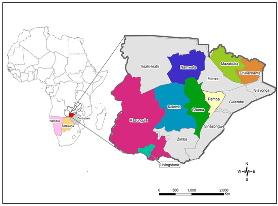 Map showing the location of study sites in Southern Province. The locator map depicts Zambia with neighbouring countries that share the border with Southern Province. The insert map shows the Southern Province of Zambia with the study sites namely Chikankata, Choma, Kalomo, Kazungula, Livingstone, Mazabuka, Namwala and Pemba districts. The maps were generated using Quantum Geographic Information System (QGIS) version 3.10 (http://www.qgis.org (accessed on 8 August 2022).