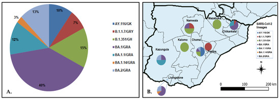 Distribution of SARS-CoV-2 lineage in the Southern Province of Zambia. Panel (A) pie chart showing SARS-CoV-2 lineages detected in the Southern Province; panel (B) proportionate distribution of SARS-CoV-2 lineages in the eight districts of the Southern Province. The map was generated using Quantum Geographic Information System (QGIS) version 3.10 (http://www.qgis.org (accessed on 8 August 2022)).