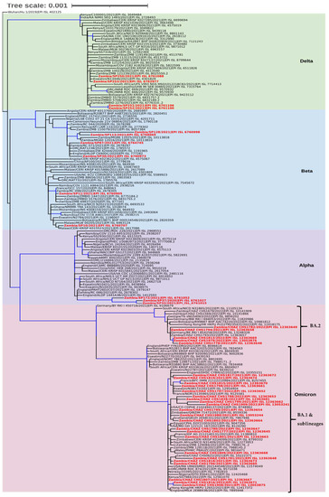 Whole-genome sequences were annotated using the reference genome of hCoV-19/Wuhan/Hu-1/2019|EPI_ISL_402125 [33]. A dataset of 180 whole genomes was created, which included 40 generated from this study and 140 retrieved from the GISAID database. Audacity Instant was used to retrieve SARS-CoV-2 whole-genome sequences from GISAID that were most similar to the sequences generated in this study. We also included reference sequences of VOCs detected in Southern Africa and other parts of the world, targeting those isolated within the same period and belonging to the same lineage as those characterized in this study. Reference sequences with stretches of more than 10% ‘NNNN’ were excluded from the analysis. Multiple sequence alignment of the sequences was performed using the FFT-NS-2 algorithm available in the multiple sequence alignment programme (MAFFT), but otherwise using default settings (https://mafft.cbrc.jp/alignment/server/index.html (accessed on 9 August 2022) [39]. The alignment was inspected in Geneious Prime v2022.0.1 (https://www.geneious.com (accessed on 9 August 2022) and gaps were trimmed. Following alignment, a maximum likelihood (ML) phylogenetic tree was constructed using the PhyML Online server (www.atgc-montpellier.fr/phyml/ (accessed on 9 August 2022) [40] using the smart model selection (SMS) [41] and the Bayesian Information Criterion. Branch support was estimated through the SH-like approximate likelihood ratio test (SH-aLRT). The ML tree was then rooted using TempEst v1.5.3 [42], which estimated the best-fitting root of this phylogeny using the heuristic residual mean squared function, aimed at minimizing the variance of root-to-tip distances. The resultant ML tree file was edited using Interactive Tree of Life (iTOL) v5, an online tool for phylogenetic tree display and annotation [43].