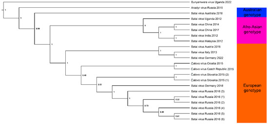BATV has a broad geographic distribution, covering temperate and tropical regions of Asia, Africa and Europe. In addition, BATV has been recovered in multiple hosts and vectors. Therefore, understanding its phylogenetic relationships is important for understanding its emergence and persistence in a range of environmentally disparate areas and taxa. By assessing a 6000 base pair region of the L-gene from 22 BATV sequences (Supplementary Table S1) in a Bayesian phylogeny, we were able to identify three clearly delineated clades, with strong posterior probability support, within BATV (Figure 1). BUNV was used as an outgroup for the analysis, and Anadyr virus (ANADV) was also included as a novel representative of the Bunyamwera group of viruses [40]. The three clades identified are geographically distinct from one another, and our analyses support previous findings that suggest there is a European genotype and an Afro-Asian genotype [4] and add a recently identified third genotype from Australia [3].