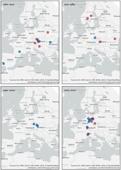 Virus isolations or molecular detections in mosquito vectors (red circles) and serological detections in mammalian hosts (blue circles) of BATV in Europe, 1960–2020. Where specific geographical locations were not available, the data point was centralized in that country or region. All geographic visualizations were created using ArcGIS Pro 2.4.