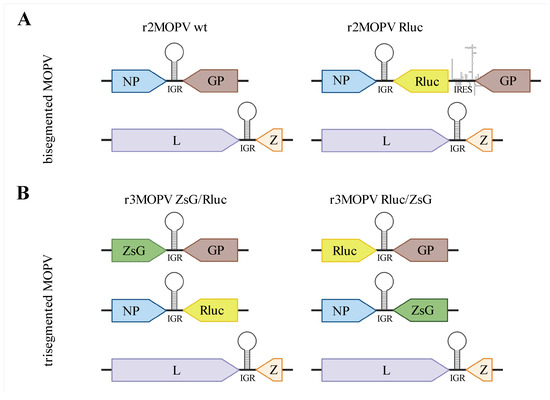 Overview of bi- and trisegmented MOPV genomes. (A) bisegmented MOPV containing wild type L and S segments or a modified S segment with a GP-IRES-Renilla luciferase (Rluc) ORF. (B) trisegmented MOPV containing two modified S segments each; either NP or GP have been replaced by Rluc or ZsGreen (ZsG) on the segment. The figure was created with BioRender.