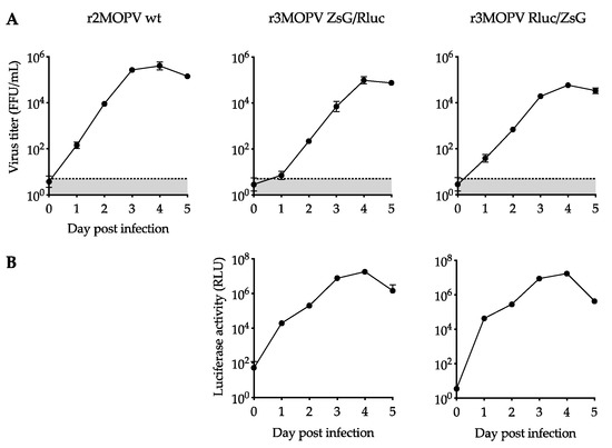 Growth kinetics of trisegmented rMOPV. Vero FM cells were infected with a MOI of 0.01 with r2MOPV wt, r3MOPV ZsG/Rluc, and r3MOPV Rluc/ZsG, and the virus replication was followed over 5 days. Virus titers were determined by immunofocus assay (A). Luciferase activity was measured for the two r3MOPV viruses (B). Plotted are the mean of three replicates and the standard deviation. The limit of detection for the titration is marked by a dashed line.