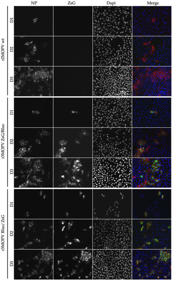 Immunofluorescence microscopy of r3MOPV. Vero FM cells were seeded on glass slides and infected with a MOI of 0.01 with r2MOPV wt, r3MOPV ZsG/Rluc, and r3MOPV Rluc/ZsG. The cells were fixed on days 1, 2, and 3 post infection and stained for NP (red). The nucleus was stained with Dapi (blue). ZsG is depicted in green.