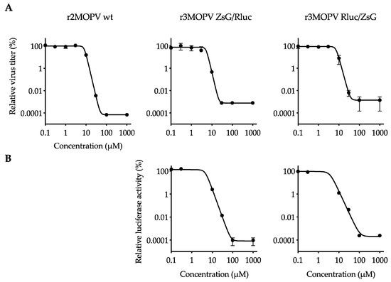 Antiviral activity of Ribavirin against MOPV. Vero FM cells were infected with r2MOPV wt, r3MOPV ZsG/Rluc, or r3MOPV Rluc/ZsG with a MOI of 0.01. Different concentrations of Ribavirin were added 1 h post infection. After 3 days, the concentration of infectious viral particles in the cell culture supernatant was measured by immunofocus assay (A). Cells were lysed and luciferase activity was determined (B). Sigmoidal dose–response curves were fitted to the data using Prism GraphPad 9. Shown are the mean and standard deviation of a representative experiment.