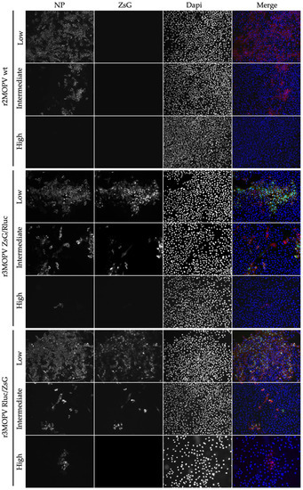 For the immunofluorescence microscopy, cells were seeded on glass slides and infected with the r2MOPV wt and the two r3MOPV. Cells were stained for NP and the nucleus was visualized with Dapi (Figure 3).