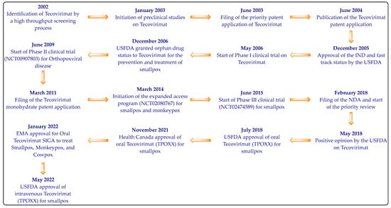 Almehmadi, M.; Allahyani, M.; Alsaiari, A.A.; Alshammari, M.K.; Alharbi, A.S.; Hussain, K.H.; Alsubaihi, L.I.; Kamal, M.; Alotaibi, S.S.; Alotaibi, A.N.; et al. A Glance at the Development and Patent Literature of Tecovirimat: The First-in-Class Therapy for Emerging Monkeypox Outbreak. Viruses 2022, 14, 1870. https://doi.org/10.3390/v14091870