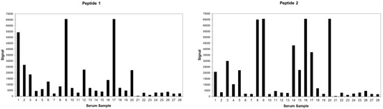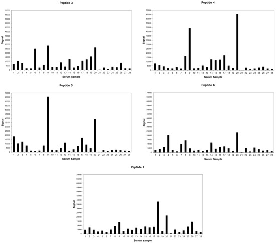 From the panel of selected sera, samples 11 and 13 were not detected by any of the selected peptides candidates, which may be due to a number of factors. Firstly, these samples were not undetected due to the stringent p-value that was used in this study, as no signal above the background noise was observed. Therefore, further investigation and retesting will need to be carried out to determine the possible cause.