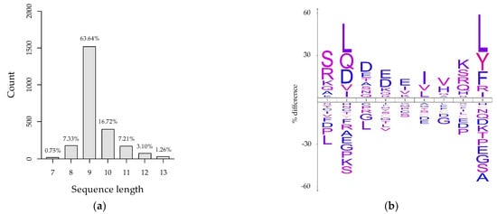 PAMs were infected with the PRRSV strain AUT15-33 at an MOI of 0.1. Additionally, another batch was mock-infected. From both naïve and infected cells, four technical replicates were produced. Since several studies, including our own unpublished results, demonstrate that MHC-I is downregulated upon PRRSV infection [15,16], cells were harvested at 18 h p.i. to ensure maximum sample yield. Successful infection of cells was confirmed in a small, separate cell culture dish by immunofluorescence (data not shown). After harvesting, the MHC-I/peptide complexes were isolated by immunoprecipitation. Eluted samples were analyzed by LC-MS/MS, and the obtained MS data searched against the AUT15-33 and Sus scrofa proteome. Database research of samples from naïve PAMs that were matched to the Sus scrofa proteome revealed a total of 2387 identified peptide groups, with peptides between 7 and 13 amino acids in length. The vast majority (63.64%) of those are nonamers (Figure 2a). These findings are in line with the literature, which demonstrates that most MHC-I bound peptides have a sequence length of nine amino acids [34]. Furthermore, the epitope anchor residues are known to preferentially be hydrophobic or basic amino acids [21]. Our data confirms a conservation of hydrophobic amino acids at the anchor residues (position 2 and 9) of 9-mer peptides (Figure 2b).