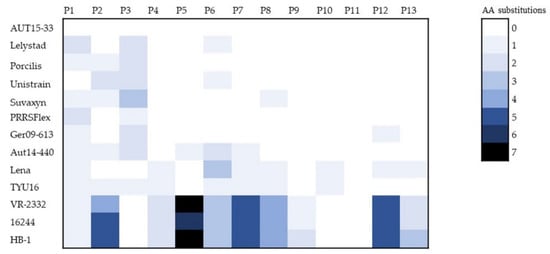 Heat map illustrating conservation of isolated AUT15-33 peptides compared to other PRRSV vaccine strains (94881: Ingelvac PRRSFLEX EU; DV: Porcilis PRRS, MSD; Amervac: Unistrain PRRS, HIPRA; 96V198: Suvaxyn PRRS MLV, Zoetis), PRRSV-1, and PRRSV-2 (VR-2332, 16244, HB-1) isolates. Numbers of amino acid substitutions are coded according to the color key. P, peptide; AA, amino acid.