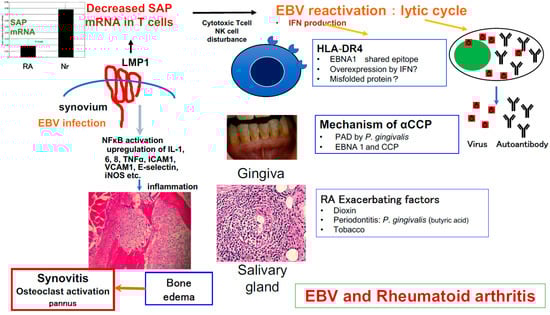 Inferring the role of EBV in RA synovitis. EBV is present in RA synovium, and LMP-1 expressed in synovial lining cells may suppress SAP function [56,104] and breaks down the normal defense mechanism against infection with EBV [85,103]. EBV activation might contribute to synovial cell proliferation, inflammation, and autoantibody production [52], and may be involved in the induction of RA synovitis. Additionally, environmental factors may contribute to EBV reactivation as follows: (1) Porphyromonas gingivalis peptidylarginine deiminase (PAD), an enzyme required for citrullination, engenders antigens leading to production of citrullinated peptides both in the gingiva and synovium [105]. (2) This bacterium also produces butyric acid, which induces EBV reactivation [106]. (3) Enhanced lytic replication of EBV induced by dioxin and tobacco is also a risk factor for the development of autoimmune diseases [107,108]. EBV infection in humanized NOG mice resulted in a pathological condition characterized by erosive arthritis that is also seen in human rheumatoid arthritis; EBV infection is thus thought to be directly involved in RA pathogenesis [92].