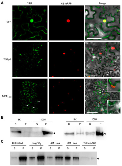- Wu, X.; Liu, J.; Chai, M.; Wang, J.; Li, D.; Wang, A.; Cheng, X.F. The Potato virus X TGBp2 protein plays dual functional roles in viral replication and movement. J. Virol. 2019, 93, e01635-18. [Google Scholar] [CrossRef]