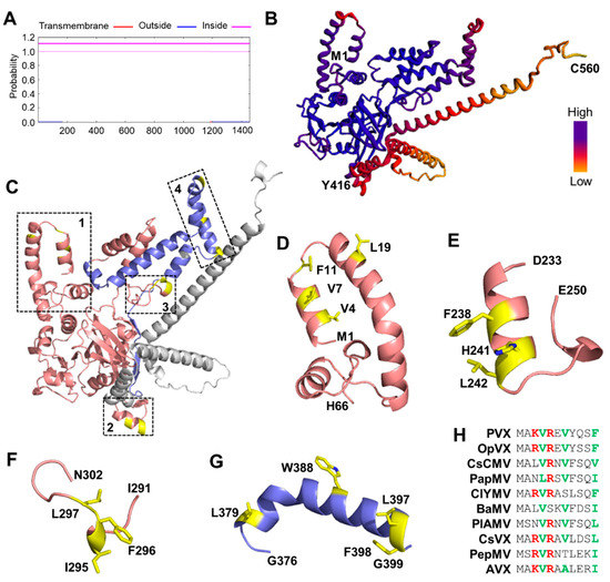 - Komatsu, K.; Sasaki, N.; Yoshida, T.; Suzuki, K.; Masujima, Y.; Hashimoto, M.; Watanabe, S.; Tochio, N.; Kigawa, T.; Yamaji, Y.; et al. Identification of a proline-kinked amphipathic α-helix downstream from the methyltransferase domain of a potexvirus replicase and its role in virus replication and perinuclear complex formation. J. Virol. 2021, 95, e0190620. [Google Scholar] [CrossRef]