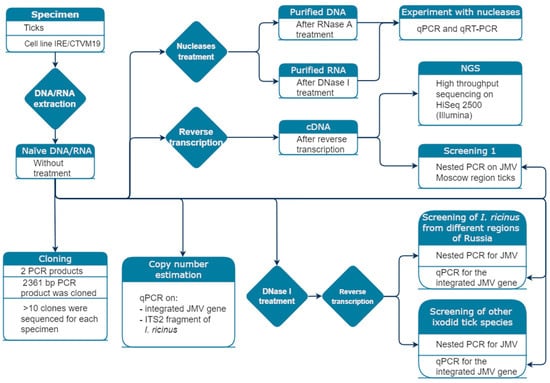 This study began from a tick survey in the Moscow region. Using system targeting of the JMV polymerase gene, we detected a high prevalence of RT-PCR-positive ticks. This led us to the hypothesis that the DNA form of the virus was integrated into the tick genome or the genome of a tick’s endosymbiont. To test this hypothesis, we performed DNase and RNase treatment and re-tested all samples for viral DNA (without a reverse transcription step) (Figure 1). Furthermore, we conducted high-throughput sequencing of several JMV-positive tick samples on HiSeq Illumina to illustrate the presence of sequences mapping to both the viral JMV polymerase gene and tick DNA. Subsequently, we also expanded the study by analyzing ixodid ticks collected in different regions of Russia for the presence of JMV DNA and/or RNA. To avoid confusion, we have created a flowchart that demonstrated the experimental strategy used in the study (Figure 1).