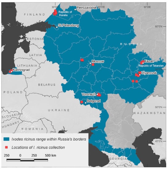 European part of Russia with depicted Ixodes ricinus collection sites.