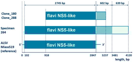 Graphical alignment of a 4005 bp contig of a JMV-positive sample obtained by HiSeq (specimen 264), two cloned samples (id 180 and 288), and a reference sample-segment 1 of Alongshan virus, strain Miass519 (GenBank accession number MN648774). The dark blue boxes represent the coding sequence of the jingmenvirus polymerase gene, the hatched box corresponds to the fragment of the Ixodes scapularis genome (GenBank accession number XM_042293990). The light blue box represents the fragment with an unknown sequence. The horizontal axis shows the length of the nucleotide sequences.