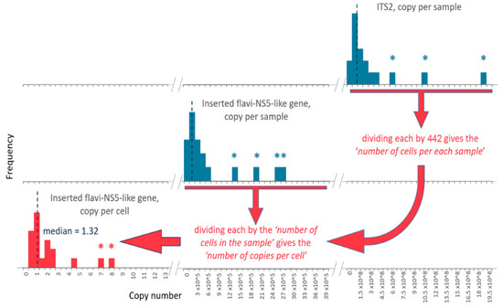 Further, we used the copy number of the integrated JMV polymerase gene and the estimated number of tick cells to calculate the copy number of the integrated JMV polymerase gene per cell: