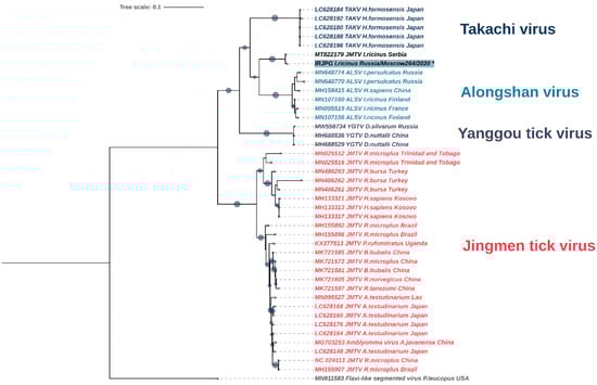 Representatives of JMV group were found in a number of ixodid tick species from several genera including Rhipicephalus, Haemaphysalis, Amblyomma, Ixodes, and Dermacentor [1,2,3,4,5,8,9]. JMVs were detected in China, Brazil, different parts of Europe, USA, Guinea, Turkey, Japan, Uganda, Lao People’s Democratic Republic, Cambodia, and Trinidad and Tobago [4,7,9,10,11,12,13,14,15,16]. In Russia, the Alongshan virus and the Yanggou tick virus were detected in Ixodes persulcatus, Ixodes ricinus, Dermacentor reticulatus, Dermacentor marginatus, Dermacentor nuttalli, and Haemaphysalis concinna ticks in different regions [3,8]. Furthermore, RNA of the Jingmen tick virus was present in the sera of patients with Crimean–Congo hemorrhagic fever in the Rostov region of Russia [6].