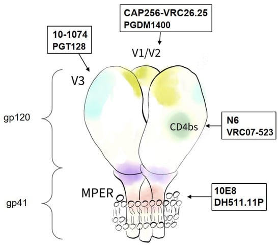 For a long time, it was believed that the antibody response does not have a significant impact on the course of infection due to high virus variability. However, in 2008, broadly neutralizing antibodies (bNAbs) that are capable of neutralizing HIV-1 of different subtypes were first discovered [,]. The mechanism of bNAb formation during long virus persistence was attributed to the repetitive hypermutation of immunoglobulin loci, which contributed to the evolution of antibodies’ specificity []. Several conserved regions of the Env glycoprotein serve as targets for bNAbs (Figure 1).