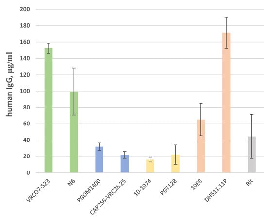 The following antibodies were used in the work: VCR07-523 and N6 (CD4bs), PGDM1400 and CAP256-VRC26.25 (V1/V2), 10-1074 and PGT128 (V3), and 10E8 and DH511.11P (MPER) [,,,,,,] (Figure 1). Rituximab, which binds to the human CD20 protein, was chosen as a control because it does not neutralize HIV-1 and is characterized by a high level of expression and stability [].