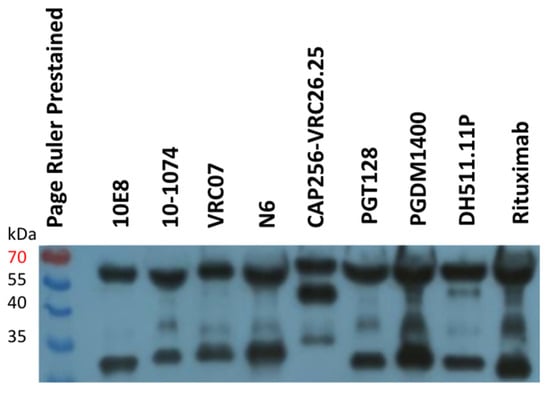Western blot analysis of broadly neutralizing antibodies under reducing conditions.