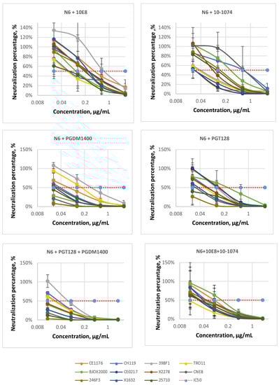 We took N6 as a base for each of the double combinations. The N6 antibody provided the maximum breadth of neutralization among all tested bNAbs because it neutralized the entire global panel. However, N6 had IC50 values within the 0.1 to 1.34 µg/mL range (Table 1). This range has a suboptimal upper bound. We assumed that the combination of antibodies would provide optimal IC50 values and reach the desired neutralization breadth. The following double combinations have been tested (Table 2, Table 3, Table 4 and Table 5, Figure 4): N6 + 10E8, N6 + 10-1074, N6 + PGDM1400, and N6 + PGT128. All of them showed better efficiency in comparison with single antibodies and were able to neutralize the whole panel of pseudoviruses. Among them, the combinations N6 + PGDM1400 and N6 + PGT128 showed higher efficiency (the IC50 ranges were 0.06–0.3 µg/mL and 0.01–0.3 µg/mL, respectively, Table 2 and Table 4).