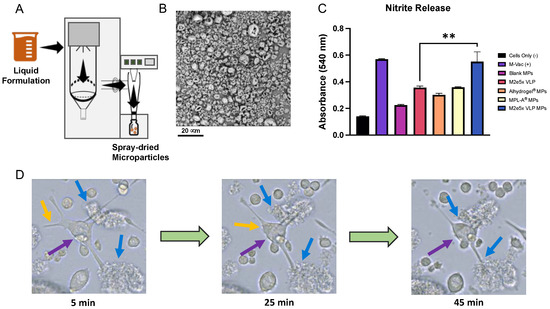 To assess the induction of nitric oxide by M2e5x VLP, M2e5x VLP MPs, and adjuvant particles in immune cells, dendritic cells (DC 2.4, ATCC, Manassas, VA, USA) were plated in a 24-well plate at a density of 5 × 104 cells/well. After the cells reached confluency, various treatments were introduced to the cells in 500 μL of complete DMEM (DMEM, 10% FBS, 1% antibiotics) media: Cells Only (negative control), M-Vac (5 μL marketed measles vaccine; positive control), blank (unloaded) MPs, M2e5x VLP suspension, Alhydrogel® MPs, MPL-A® MPs, and M2e5x VLP MPs. For M2e5x VLP, 0.5 μg total M2e5x VLP suspension was added to the wells. For M2e5x VLP MP and adjuvant MP groups, approximately 10 μg MPs (M2e5x VLP, Alhydrogel®, or MPL-A®) was added to each well. The plates were incubated for 24 h after which the Griess’ Assay was performed to assess nitrite production. Post incubation, 500 μL of cell supernatant was removed from sample wells and centrifuged at 6000 rpm for 3 min to eliminate any cellular debris. Next, 50 μL of supernatant from each sample was spun down and added to a 96-well plate. Next, 50 μL of 1% sulphanilamide was added to the wells. The plates were then covered in foil and incubated at room temperature (RT) for 5 min in the dark. Next, 50 μL of 0.1% naphthylenediamine (NED) in 5% phosphoric acid was added to each well of the plate. The plates were then covered in foil and placed on a shaker for 5 min. The plates were then read at 540 nm using a BioTek Synergy plate reader (BioTek, Winooski, VT, USA).