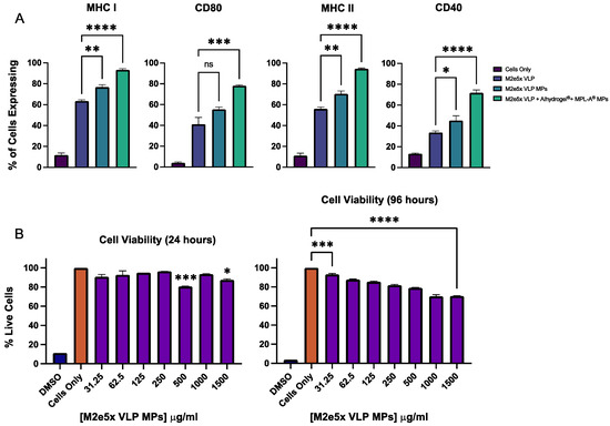 In a 96-well plate, 1 × 104 dendritic cells were plated per well. After cells reached confluency, various treatments were introduced to cells: 10 μL dimethyl sulfoxide (DMSO; Sigma Aldrich, St. Louis, MO, USA), Cells Only (no treatment), and various concentrations of M2e5x VLP microparticles ranging from 31.25 to 1500 μg/mL. Each particle-containing well received 100 μL of particle suspension. For short-term cytotoxicity, the cells were treated for 24 h whereas for long-term cytotoxicity, the cells were treated for 96 h. After the incubation period, the cells were washed three times with PBS. Next, 10 μL of 0.5% w/v MTT reagent stock (Sigma Aldrich, St. Louis, MO, USA) was added to all wells. Thereafter, 90 μL of complete DMEM was added to each well. The plate was then incubated for 4 h to allow formation of the purple precipitate by metabolically active (live) cells. Next, media were removed and 100 μL of DMSO was added to each well. The plate was then covered in foil and placed on a shaker for 15 min to solubilize the precipitate. The plate was then read at 570 nm. The average absorbance of the cells-only group (untreated) was set as 100% cell viability. The following equation was used to calculate cell viability in other groups: average % cell viability = (absorbance of test group/absorbance of Cells Only) × 100.
