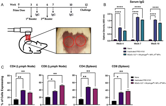 For proof of concept to demonstrate how in vitro antigen presentation may translate to in vivo efficacy, 4–6-week-old Swiss Webster (CFW) mice (Charles River, Wilmington, MA, USA) were immunized as follows (n = 5): Naïve (negative control), Inactivated PR8 H1N1 (5 μg–positive control), and M2e5x VLP + Alhydrogel® + MPL-A® MPs (200 μg M2e5x VLP MPs + 1000 μg Alhydrogel® MPs + 100 μg of MPL-A® MPs). Two days prior to immunization, the dorsal sides of mice were shaved with a hair trimmer along with the addition of depilatory cream (Nair™, Church and Switch Co., Inc., Ewing, NJ, USA). For immunizations, the microparticles were suspended in PBS. All groups except Naïve received two applications of the Precise Laser Epidermal System (P.L.E.A.S.E.®) ablative laser. Laser ablation parameters consisted of a pulse duration of 125 microseconds, repetition rate of 200 Hz, 2 pulses/pore, pore diameter of 220 microns, pore density of 80 pores/cm2, and maximum pore depth of 2 mm. Next, the inactivated PR8 H1N1 or MP vaccine suspensions were pipetted onto newly formed micropores on the skin. Each mouse received 3 immunizations at 3-week intervals (weeks 0, 3, and 6). Blood was collected at weeks 4, 7, and 10 for assessing serum IgG. In brief, whole blood was allowed to clot at room temperature for 30 min before being centrifuged at 1500 G for 10 min. The obtained serum was stored at −80 °C until use. Six weeks after the final booster, the mice were challenged intranasally with 50 μL of an 0.5 × LD50 dose of A/Philippines/2/82 (H3N2) to assess T-cell responses of vaccinated mice compared to naïve mice post challenge. The mice were monitored for 14 days post challenge after which they were sacrificed.