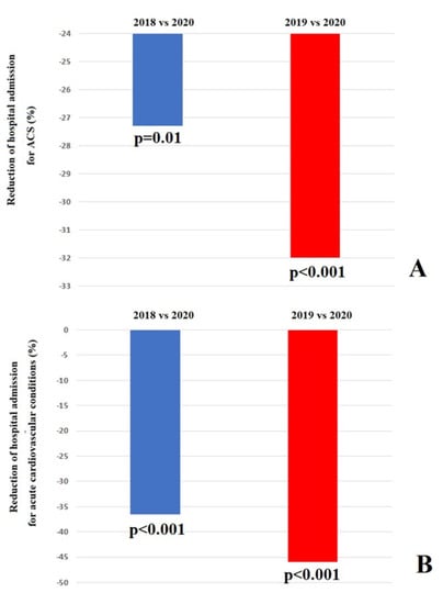 Compared to the historical cohorts, a significant decrease in the number of ACS cases was observed in 2020 (from 1160 to 843, −27.3%, p = 0.01 and from 1239 to 843, −32%, p < 0.001, comparing 2018 versus 2020 and 2019 and 2020, respectively) (Figure 2, Panel A). Similarly, the proportion of patients hospitalized for acute CV conditions decreased during the first and second wave COVID-19 pandemic when compared to the historical cohorts (from 3456 to 2195, −36.5%, p < 0.001 and from 3694 to 2195, −40.6%, p < 0.001, comparing 2018 versus 2020 and 2019 and 2020, respectively) (Figure 2, Panel B).