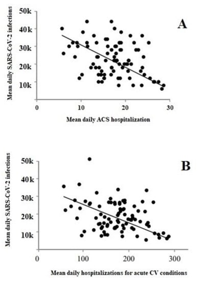 Pearson’s correlation between the number of COVID-19 cases and both ACS hospital admissions (Panel (A)) and hospitalizations for acute CV conditions (Panel (B)).